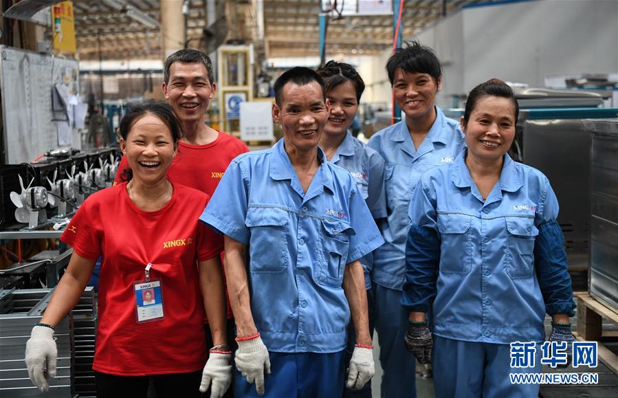 在佛山市三水区广东星星制冷设备有限公司车间内,来自四川凉山彝族自治州盐源县的何公各(左二)和工友们合影(6月22日摄)。 新华社记者 邓华 摄