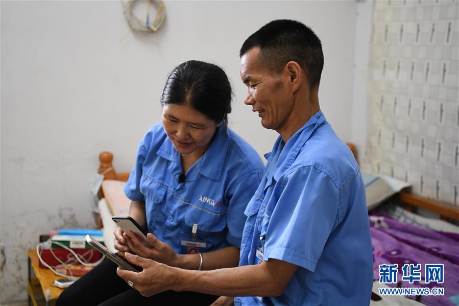 在佛山市三水区广东星星制冷设备有限公司提供的夫妻宿舍里,李力挖(右)、何公各在休息时间玩手机(6月22日摄)。 新华社记者 邓华 摄