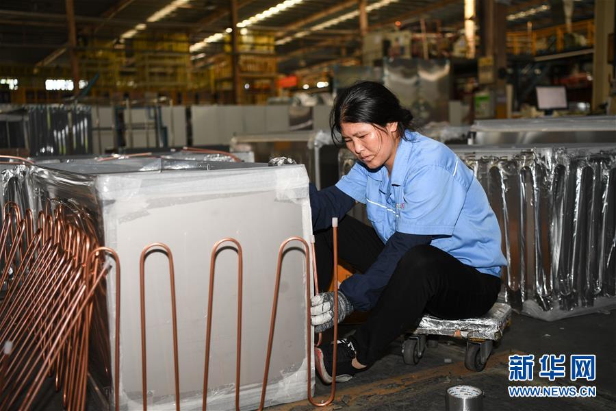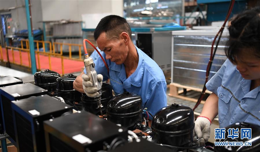 在佛山市三水区广东星星制冷设备有限公司车间内,来自四川凉山彝族自治州盐源县的李力挖在流水线上组装作业(6月22日摄)。 新华社记者 邓华 摄