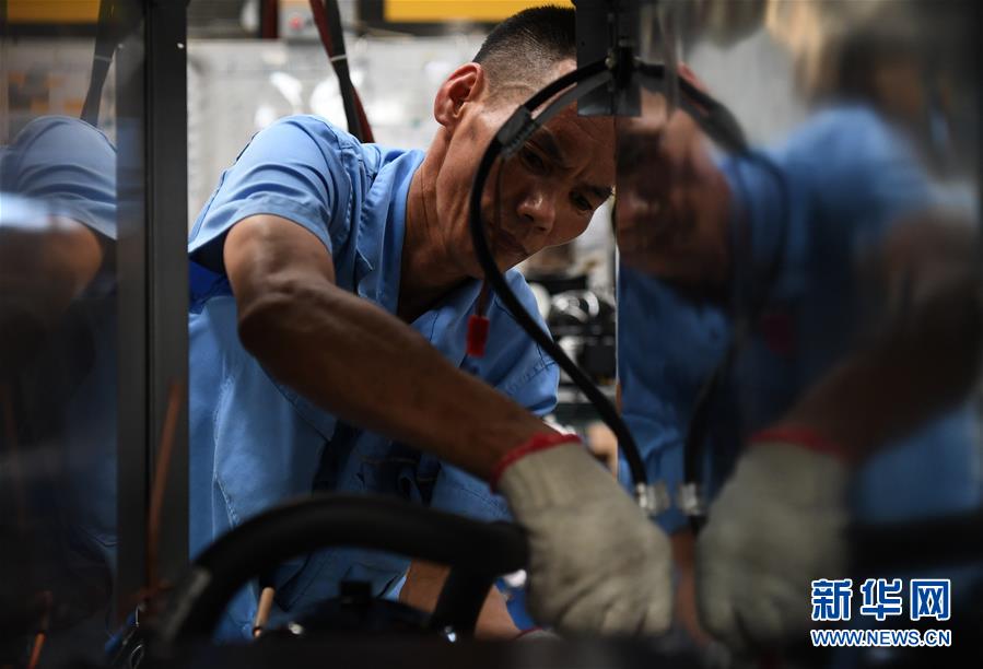 在佛山市三水区广东星星制冷设备有限公司车间内,来自四川凉山彝族自治州盐源县的何公各在组装设备(6月22日摄)。 新华社记者 邓华 摄