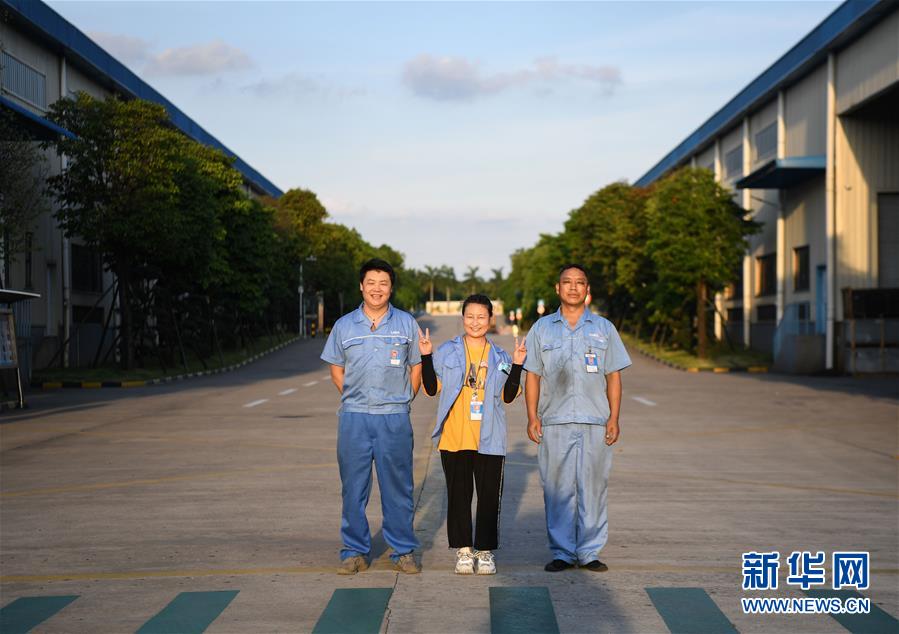 在佛山市三水区广东星星制冷设备有限公司,来自四川凉山彝族自治州盐源县的贫困务工人员伍元国、易争咪、董正军(从左至右)下班后在厂区合影,他们通过东西部扶贫协作在这里实现就业(6月22日摄)。 新华社记者 邓华 摄