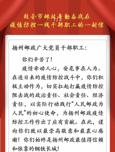 “今年以来,扬州公司克服各种不利影响,改革创新取得了明显成效。面对当前扬州严峻复杂的疫情防控形势,你们一手抓防疫一手抓发展,取得了很好的效果,希望你们继续按照地方政府要求,全力做好疫情防控各项工作。坚持人民至上、生命至上,把困难估计得更充分,把形势考虑得更严峻,齐心协力、攻坚克难,在保证疫情防控要求的前提下,努力彰显中国邮政的责任担当,坚决打赢疫情防控和经营发展的‘双胜利’!请向广大扬州邮政员工转达省分公司党委的诚挚问候!”