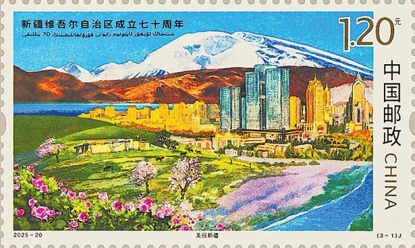 邮票图案采用岩彩绘画技法创作。第一枚“美丽新疆”,画面主体为新疆城市美景,前景绽放的玫瑰代表塔克拉玛干沙漠“锁边”工程,背景为昆仑山慕士塔格峰和卡拉库里湖。第二枚“团结和睦”,画面表现了新疆各民族、各行业群众团结和谐、亲如一家的场景。第三枚“开放高地”,画面以中欧班列、霍尔果斯国门为主体,远景展现了乌鲁木齐国际机场、光伏电站和博格达峰。邮票充分展现了在新疆这片美丽、广袤的土地上,传统与现代交织,自然与人文共生,古老与青春共舞;生动描绘了各族群众获得感、幸福感、安全感不断增强的美好图景,各族群众像石榴籽一样紧紧抱在一起,在中国式现代化进程中更好建设团结和谐、繁荣富裕、文明进步、安居乐业、生态良好的美丽新疆。