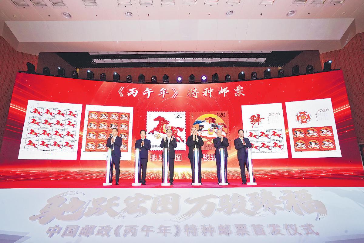 本报讯(记者 李伟)驰跃宏图,万骏臻福。1月5日,《丙午年》特种邮票首发仪式在人民日报社国际报告厅隆重举行。