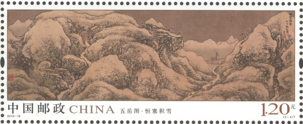 中国邮政定于2019年8月3日发行《五岳图》特种邮票1套5枚,小全张1枚。详情如下: